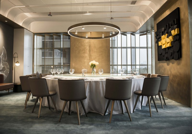 以黑色和金色為主色調(diào)的梧桐PLUS,選用流動(dòng)的線條對(duì)餐廳空間進(jìn)行分割。桌與桌之間的距離保證了食客對(duì)話的私密性和安全性。即使沒(méi)有預(yù)定到包廂,也不用擔(dān)心旁邊食客的閑聊會(huì)影響到彼此。