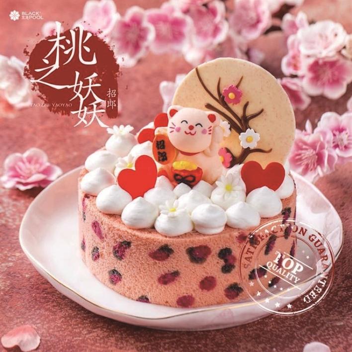 據(jù)黑池產(chǎn)品經(jīng)理介紹,“招郎蛋糕”是黑池最近重磅推出的新產(chǎn)品。蛋糕周圍覆盆子果干點(diǎn)綴而成的粉色豹紋,讓整個(gè)蛋糕充滿了野性魅惑又不失少女甜美。最為吸引眼球的,則是蛋糕表面,被桃花簇?fù)碇囊恢弧罢欣蛇鳌?。這只軟萌可愛的“招郎喵”,象征著,對(duì)得到這款蛋糕的人,最美好的祝愿,希望他們能夠遇到最好的愛情,找到心目中的那個(gè)他。