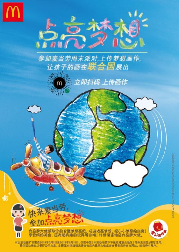 3月1日起, 麥當(dāng)勞在全國(guó)超過1000家餐廳推出麥當(dāng)勞“點(diǎn)亮夢(mèng)想”主題派對(duì),為孩子們打造夢(mèng)想加油站?;顒?dòng)以“夢(mèng)想”為主題,以繪畫為載體,鼓勵(lì)孩子們秀出才華展現(xiàn)夢(mèng)想?;顒?dòng)將征選30位兒童的畫作在聯(lián)合國(guó)展出。
