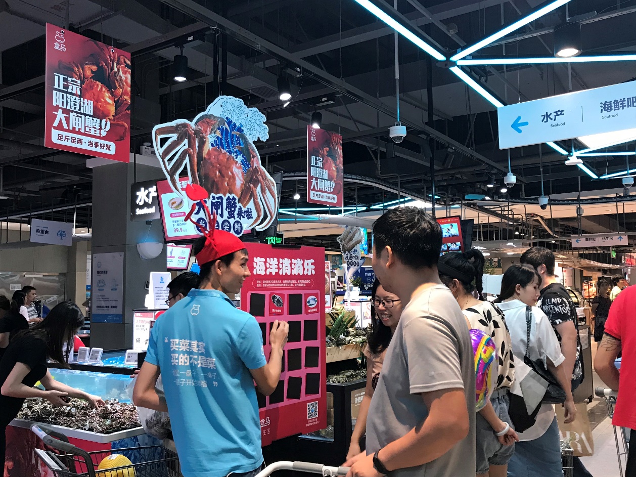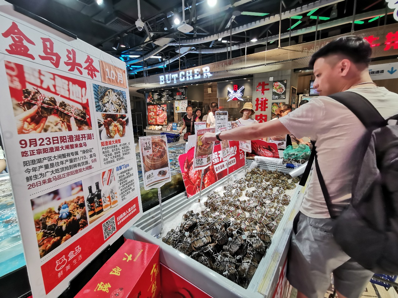 其中爆款非大閘蟹莫屬。民間有個講究:“九雌十雄”,農(nóng)歷九月吃母的大閘蟹,農(nóng)歷十月吃公的,因為那時候大閘蟹的蟹黃和蟹膏是最好的。黃金周期間,盒馬深圳大閘蟹銷量與9月相比增長六倍。其中最受歡迎的是2兩重的母蟹,盒馬皇庭廣場店假期里試過一天賣出近兩千只大閘蟹。