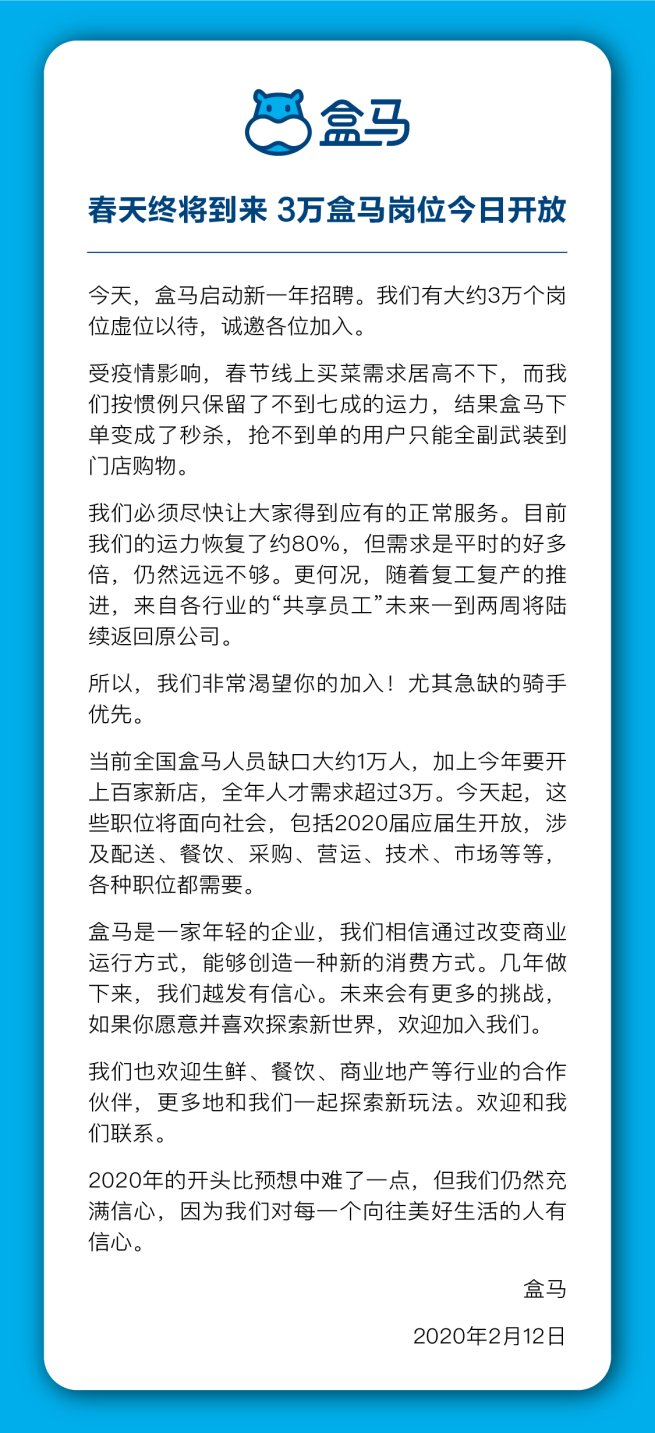 2月12日,盒馬宣布開啟新一輪招聘,開放3萬個崗位,包括總部采購、技術(shù)、運營等,也包括一線門店小二,其中配送小哥最為緊急。