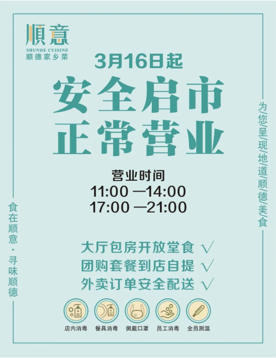 為了保證消費(fèi)者和員工的健康,順意順德家鄉(xiāng)菜做足的準(zhǔn)備工作,聘請(qǐng)了專業(yè)公司對(duì)全店進(jìn)行專業(yè)消毒凈化,每個(gè)員工上崗前均進(jìn)行測(cè)量體溫、深度清潔雙手等措施,服務(wù)員在服務(wù)時(shí)也秉承無(wú)接觸的原則,傳菜加蓋隔離、餐具高溫消毒、到店測(cè)溫、安心送等種種服務(wù)讓消費(fèi)者感到安心。