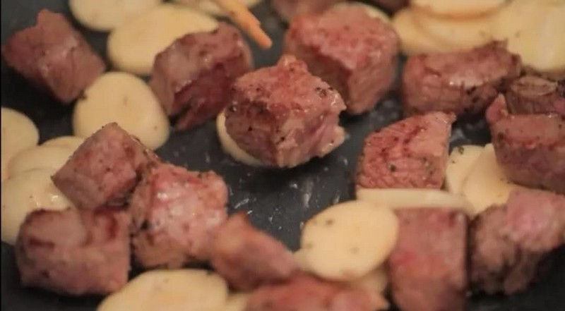 5、將牛肉粒加入煎鍋中,稍微煎到5成熟,加入厚蒜片,兜炒一番,后加入少許油,否則無法爆炒到蒜片;