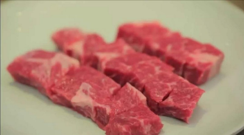 1、將牛扒切成方塊狀,長(zhǎng)寬大約在1.5cm左右;