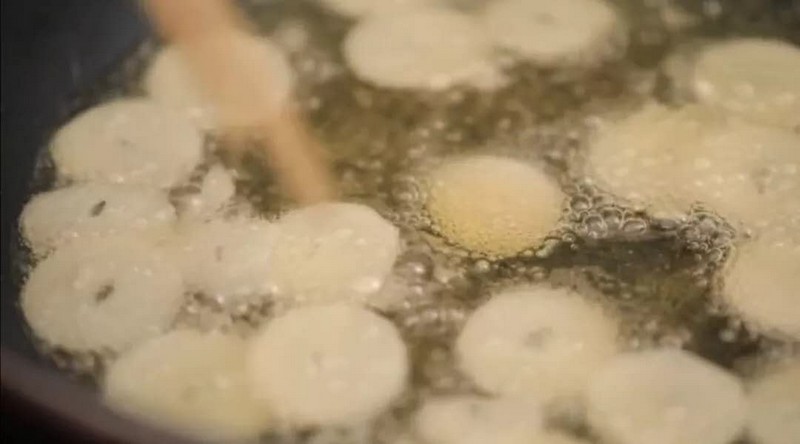 3、開煎鍋,加油,將薄片的蒜片放入鍋中炸,需要攪開來,否則粘在一起就炸不脆??吹剿忸^有一些泡泡出來了,炸到?jīng)]有泡泡就可以了。將炸到金黃色的蒜片夾起,放在廚房用紙上,過濾掉油脂;