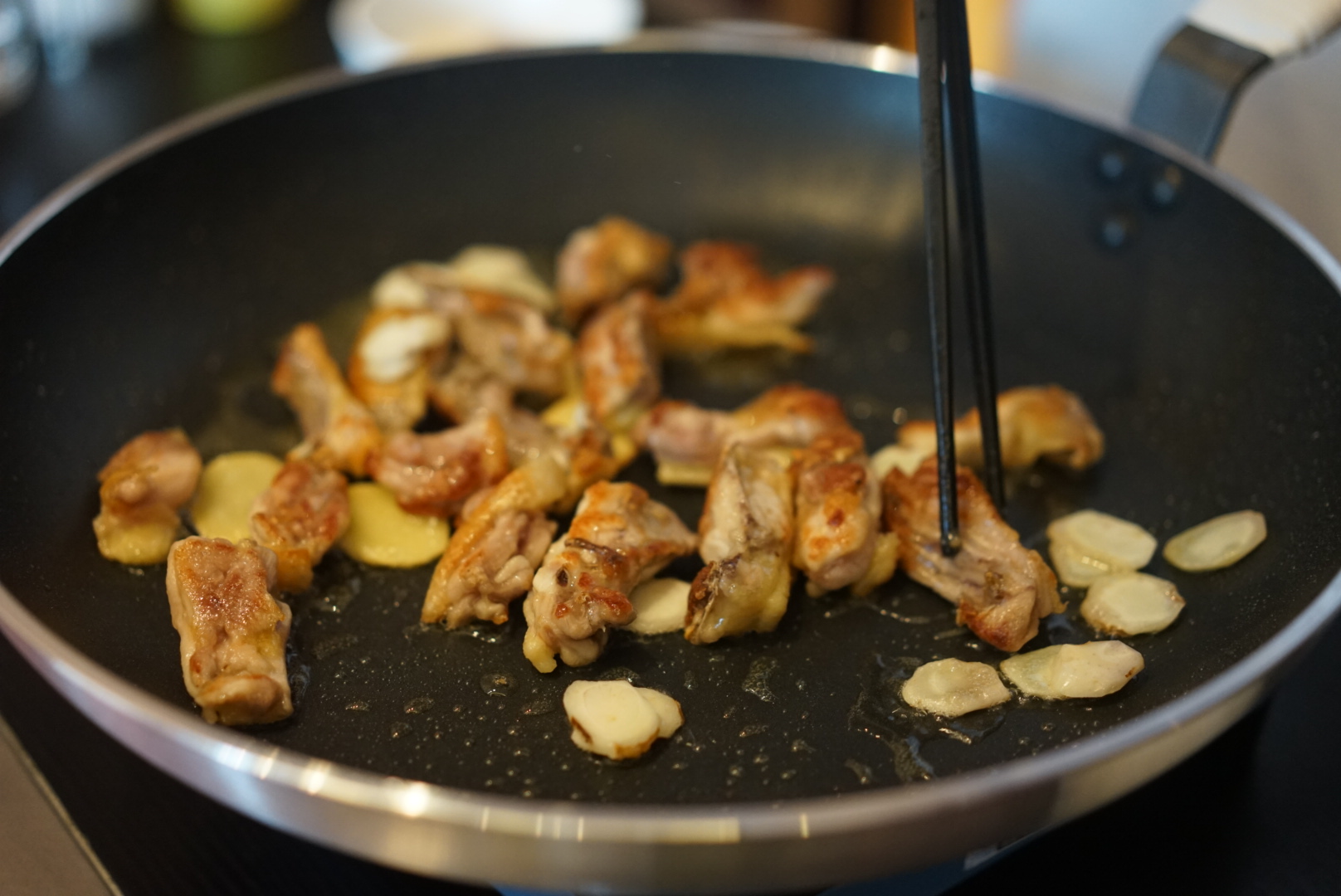 2、起煎鍋,食用油淡淡一層鋪煎鍋。放上雞件,將雞肉的一面朝下,雞皮朝上。在煎鍋的空余之地放上姜片熱一熱。待雞肉一面熟了以后,翻過另一面。