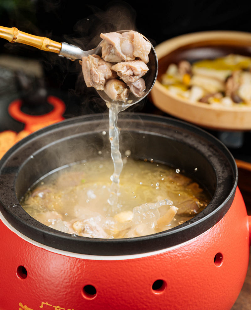 以雞為主要烹飪食材,洞庭土雞館的湖南師傅創(chuàng)造出了不一樣的菜肴。每桌食客坐下,都少不得一碗暖乎乎的洞庭土雞湯來“開場”。它的登場也相當(dāng)有氣勢,長沙紅磚窯特別定制的大湯鍋,內(nèi)膽是紫砂構(gòu)造,這樣的設(shè)計(jì)既是出于美觀,又是出于更長時(shí)間更有效保溫的效果。俗話說得好,工欲善其事必先利其器。土雞方面,師傅特別精選了湖南竹山雞,肉質(zhì)的彈性略勝一籌,據(jù)介紹,竹山雞的養(yǎng)殖戶開放了大片山頭讓雞跑,放養(yǎng)時(shí)間足夠長,達(dá)到一年多,在如今快節(jié)奏的社會里已實(shí)屬難得。老雞加山泉水文火熬3個(gè)小時(shí),并沒有其他的味道干擾,簡簡單單就是本味。