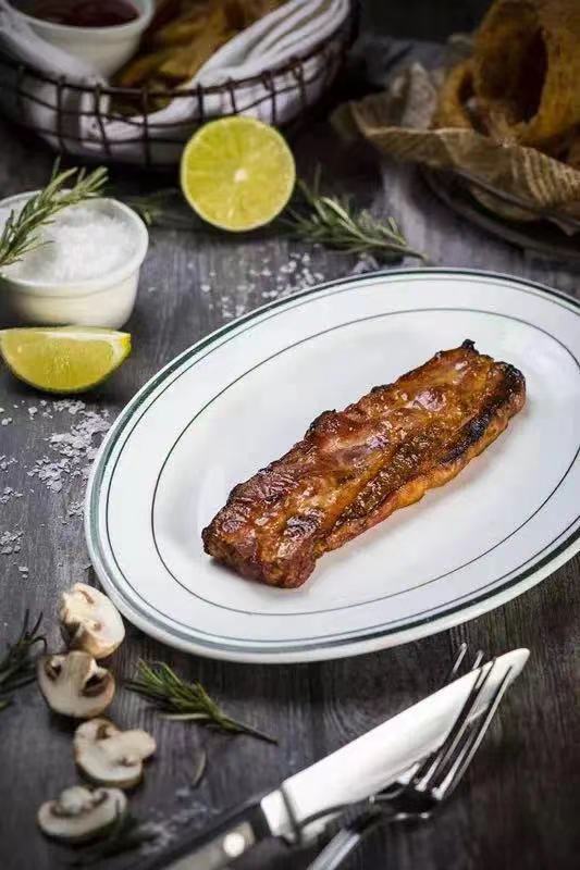 超厚焦脆培根同樣令人驚喜,精選大塊五花肉,手動刨成手指厚度的培根肉,先煎后烤,外皮烤得焦脆,內里卻嫩到不可思議。