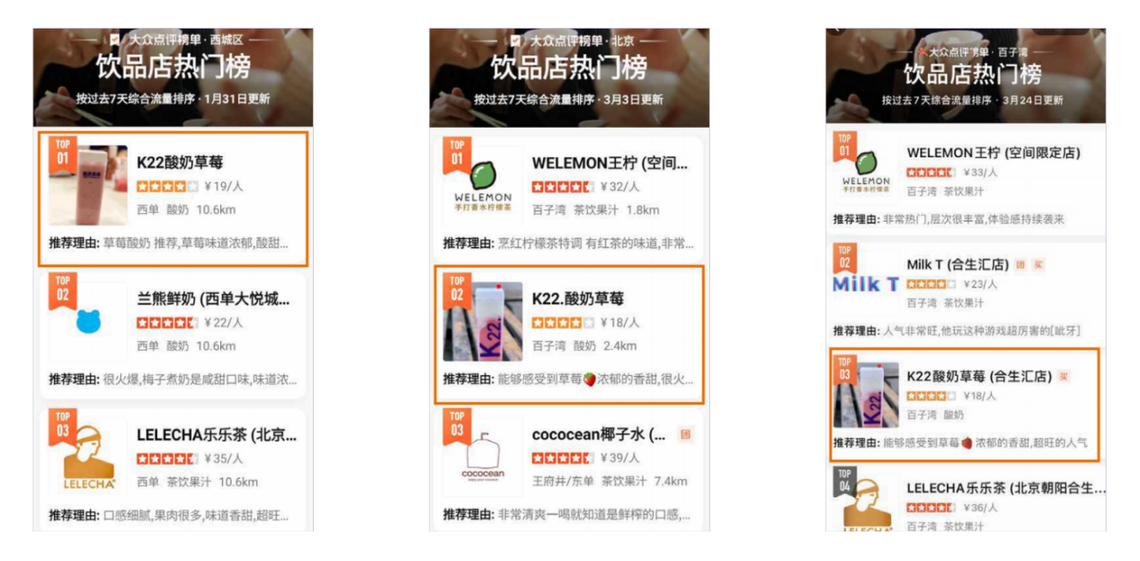自帶流量的K22.酸奶草莓很快把店開進了北京一線商圈——西單大悅城,并在當時火速登頂大眾點評西城區(qū)熱門榜 TOP1,成為當之無愧的北京排隊王。