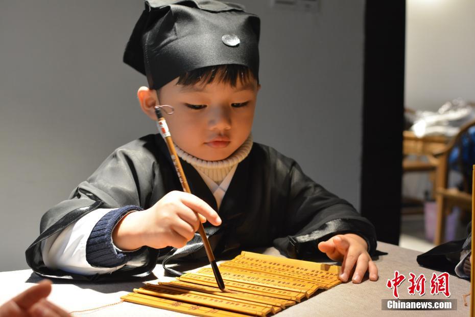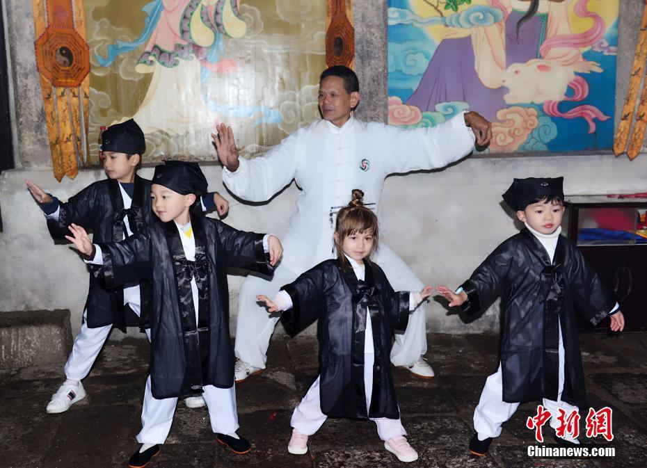 10月16日,在“道教名山”、世界自然遺產(chǎn)地江西上饒三清山,5名來自中外的萌娃身穿統(tǒng)一道服,手持竹簡(jiǎn),在三清宮跟著道教師傅朗讀《道德經(jīng)》、《弟子規(guī)》,學(xué)習(xí)太極拳、書法、古箏等中國(guó)傳統(tǒng)文化。這群萌娃中年齡最小的僅11個(gè)月,年齡最大也只有6歲。程希雪攝
