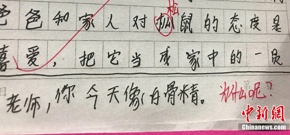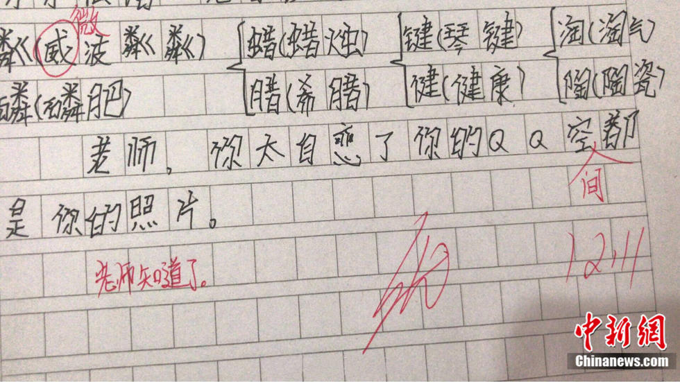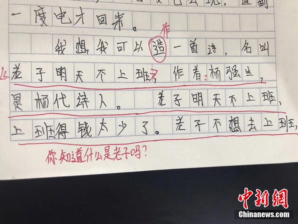 近日,貴州省谷隴翁板小學的語文老師張沁文,曬出了學生寫在作業(yè)里的“金句”?!袄蠋煟闾詰倭?,QQ空間都是自己照片”;“顏值升高才有人喜歡您”……孩子們的童言無忌令人哭笑不得,老師的評論也很亮眼。