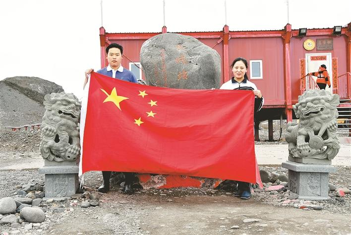 姚靜母子穿著深圳校服在南極長(zhǎng)城站前合影。