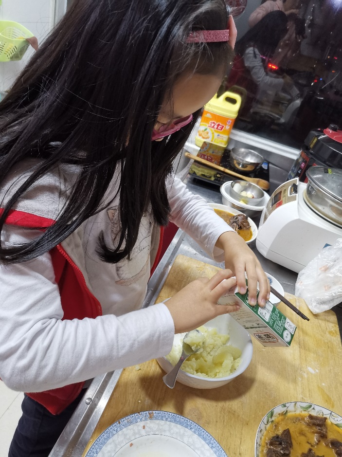我們  經(jīng)常給奶奶打下手,烹飪也是其樂無窮。茜茜最喜歡的是可以媲美橡皮泥的面食,捏來捏去很有趣,還可以嘗試些喜歡的食物,土豆泥,曲奇,等等。