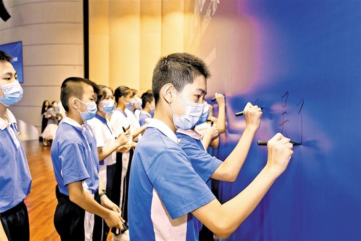 “自覺(jué)遵守互聯(lián)網(wǎng)相關(guān)政策和法律法規(guī),積極培育和踐行社會(huì)主義核心價(jià)值觀……”海韻學(xué)校的學(xué)生們現(xiàn)場(chǎng)朗讀《寶安青少年“文明上網(wǎng)·健康成長(zhǎng)”倡議書(shū)》,并在承諾墻上莊嚴(yán)地簽下自己的名字。