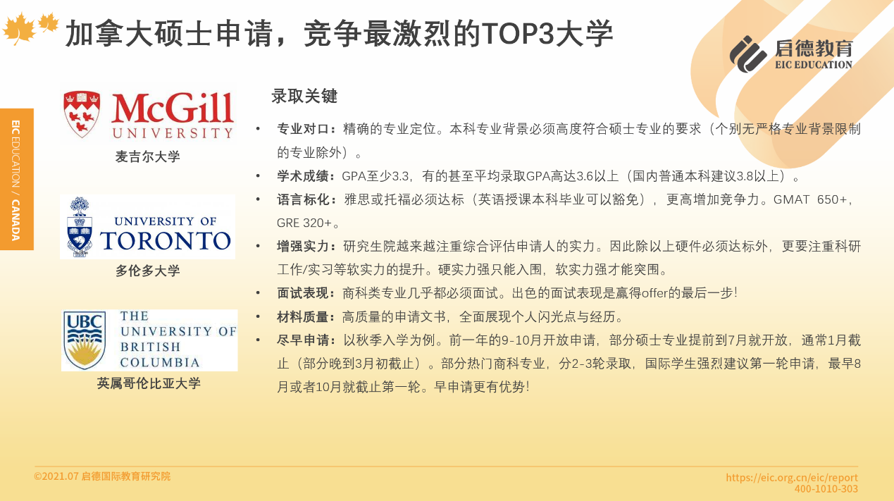 據(jù)啟德留學(xué)加拿大項目介紹,加拿大碩士申請競爭最激烈的三所大學(xué)為麥吉爾大學(xué)、多倫多大學(xué)與英屬哥倫比亞大學(xué)。申請人 GPA至少達到3.3,有的甚至要求平均錄取 GPA高達3.6以上(國內(nèi)普通本科建議3.8以上);雅思或托福必須達標(英語授課本科專業(yè)可以豁免), GMAT650+, GRE320+;除硬件必須達標外,加拿大名校注重科研、工作 /實習(xí)等軟實力的提升;商科類專業(yè)幾乎都必須面試。