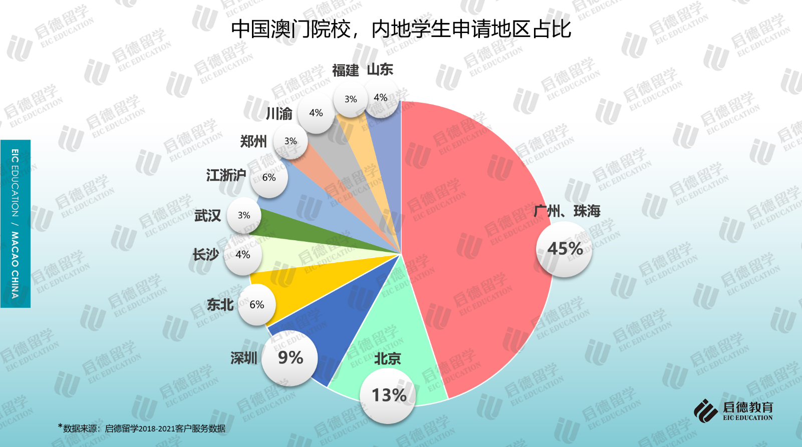 另一組啟德留學(xué)的澳門院校申請(qǐng)人來(lái)源數(shù)據(jù)顯示,廣東省廣州、珠海、深圳三個(gè)城市的學(xué)生申請(qǐng)澳門院校的占比超過(guò)50%,北京學(xué)生占比13%,分析原因,除了廣東省與澳門在文化上、生活方式上的親近性以及距離較近的優(yōu)勢(shì)外,也與澳門院校對(duì)部分區(qū)域申請(qǐng)人的加分政策有一定關(guān)系。如澳門大學(xué)對(duì)北京市及廣東省高考考籍的學(xué)生有加5分的優(yōu)惠政策,而對(duì)于廣東省珠海市考籍和橫琴戶籍的應(yīng)屆高考生又特別優(yōu)待,實(shí)施15-20分的加分優(yōu)惠政策。