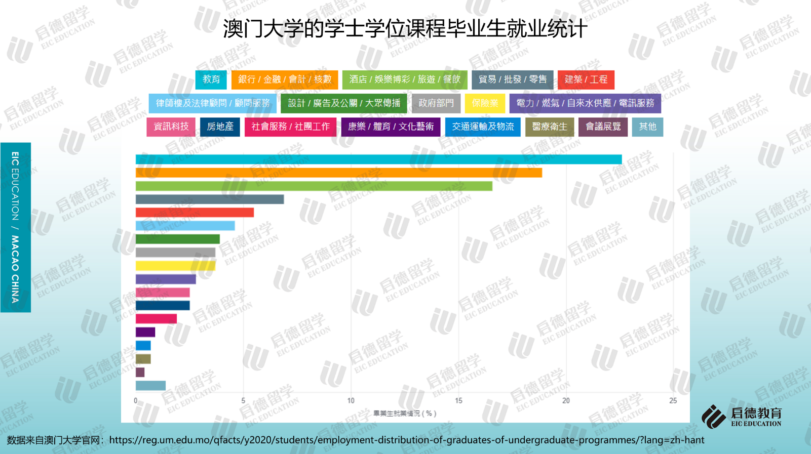澳門大學(xué)2019/2020年本科畢業(yè)生就業(yè)調(diào)查顯示,畢業(yè)生就業(yè)人數(shù)最多的行業(yè)排名前三位為教育行業(yè)(22.6%)、銀行/金融/會(huì)計(jì)/核數(shù)(18.9%)、酒店/娛樂(lè)博彩/旅游/餐飲(16.6%)。澳門科技大學(xué)2018/2019學(xué)年本科畢業(yè)后去向調(diào)查顯示,就業(yè)的本地生中,4.2%選擇在內(nèi)地工作;就業(yè)的非本地生中,在粵港澳大灣區(qū)工作的約占54.3%。本科升學(xué)后去向調(diào)研顯示,除了中國(guó)澳門(25.1%)外,英國(guó)(31.9%)、澳大利亞(15.8%)、中國(guó)香港(7.5%)、美國(guó)(5.7%)、新加坡(3.6%)也是主要升學(xué)地區(qū)。