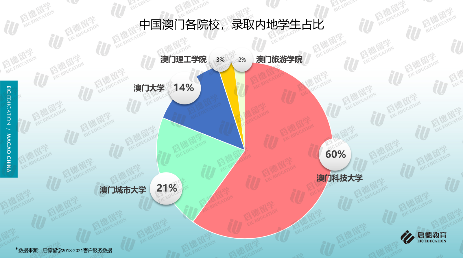 啟德留學(xué)2018-2021客戶服務(wù)數(shù)據(jù)顯示,澳門地區(qū)高校的申請(qǐng)中,七成以上申請(qǐng)澳門科技大學(xué)(41.1%)和澳門大學(xué)(30.6%);作為私立院校的澳門城市大學(xué)因?qū)W科設(shè)置比較全面,申請(qǐng)占比為17.5%;作為公立院校的澳門理工學(xué)院(9.4%)、澳門旅游學(xué)院(1.4%)由于專業(yè)設(shè)置較少,申請(qǐng)占比相對(duì)較少。從啟德留學(xué)澳門地區(qū)高校的錄取數(shù)據(jù)來(lái)看,澳門科技大學(xué)的錄取占比為60%,澳門大學(xué)的錄取占比為14%,澳門城市大學(xué)、澳門理工學(xué)院、澳門旅游學(xué)院的錄取占比分別為21%、3%與2%。