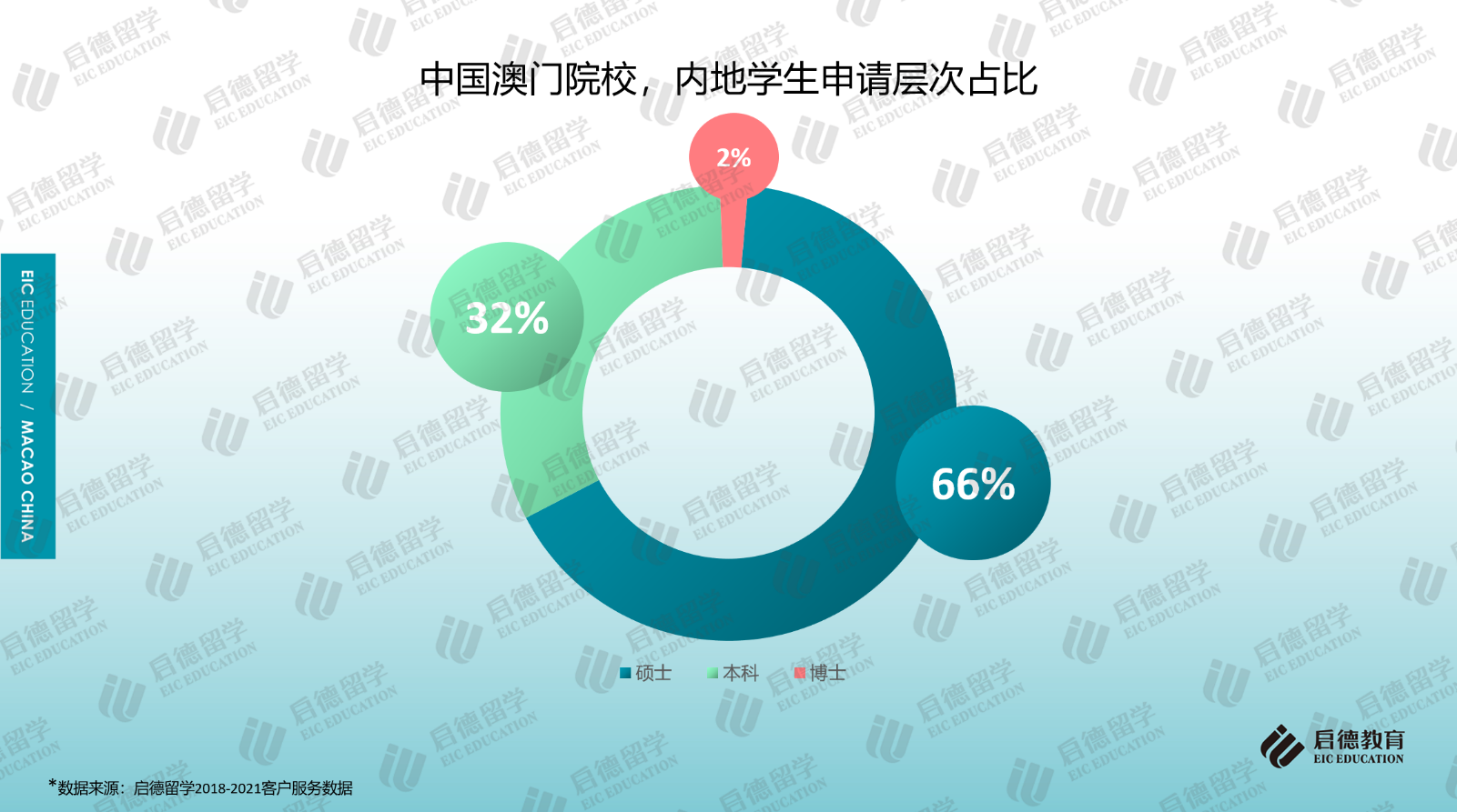 啟德留學(xué)2018-2021客戶服務(wù)數(shù)據(jù)顯示,前往澳門求學(xué)的內(nèi)地學(xué)生選擇攻讀碩士的比例較高,且申請(qǐng)量呈現(xiàn)逐年小幅上升的趨勢(shì),2021年為66%;攻讀本科的占比超過(guò)30%,除高考生外,今年也開(kāi)始有參加國(guó)際考試的內(nèi)地學(xué)生申請(qǐng)澳門的高校。QS官網(wǎng)2021年數(shù)據(jù)顯示,澳門大學(xué)非本地生(3921人)中研究生與本科生的占比分別為55%與45%;澳門科技大學(xué)非本地生(8869人)中,研究生與本科生的占比分別為32%與68%。