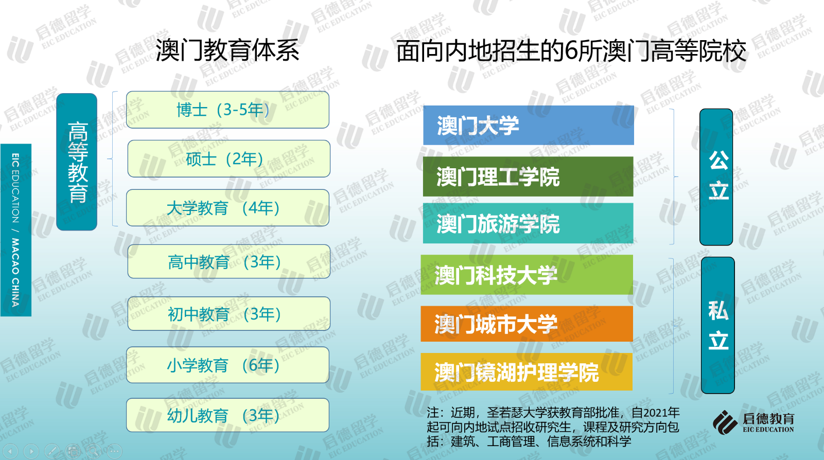 作為中西文化交匯的國(guó)際旅游城市,中國(guó)澳門的輕工業(yè)、旅游業(yè)、酒店業(yè)和娛樂(lè)場(chǎng)使其成為中外游客青睞的旅游度假勝地。澳門與香港同樣都具有獨(dú)特的地緣優(yōu)勢(shì),既有中國(guó)文化的根基,又融會(huì)貫通了歐美教育的優(yōu)勢(shì),中文、葡文、英文學(xué)制并存的多語(yǔ)言教學(xué)與多元文化交融的國(guó)際化環(huán)境,為學(xué)生提供了開(kāi)闊的國(guó)際視野和學(xué)術(shù)氛圍,也為當(dāng)?shù)馗叩冉逃陌l(fā)展創(chuàng)造了良好的條件。目前,澳門大學(xué)、澳門理工學(xué)院、澳門旅游學(xué)院、澳門城市大學(xué)、澳門鏡湖護(hù)理學(xué)院、澳門科技大學(xué)等6所高校獲教育部批準(zhǔn)可面向內(nèi)地招收本科生及研究生,圣若瑟大學(xué)獲教育部批準(zhǔn)自2021年起可面向內(nèi)地試點(diǎn)招收研究生。