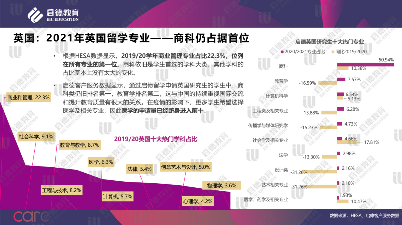 長期以來,由于其廣闊的就業(yè)前景,F(xiàn)AME專業(yè)(金融、會計、管理、經(jīng)濟(jì))和STEM專業(yè)(科學(xué)、技術(shù)、工程和數(shù)學(xué))一直備受留學(xué)生的青睞。2021 《美國門戶開放報告》數(shù)據(jù)顯示,半數(shù)以上的中國內(nèi)地學(xué)生就讀STEM專業(yè)(物理/自然科學(xué)、工程學(xué)、醫(yī)療健康、數(shù)學(xué) /計算機(jī) ),16.6%就讀商業(yè)與管理專業(yè)。英國高等教育統(tǒng)計局 HESA數(shù)據(jù)顯示,2019/20學(xué)年商業(yè)管理專業(yè)占比為22.3%,位列在英國研究生專業(yè)的第一位,其他依次為:社會科學(xué)、教育與教學(xué)、工程與技術(shù)、醫(yī)學(xué)、計算機(jī)、法律、創(chuàng)意藝術(shù)與設(shè)計、心理學(xué)以及物理學(xué)。