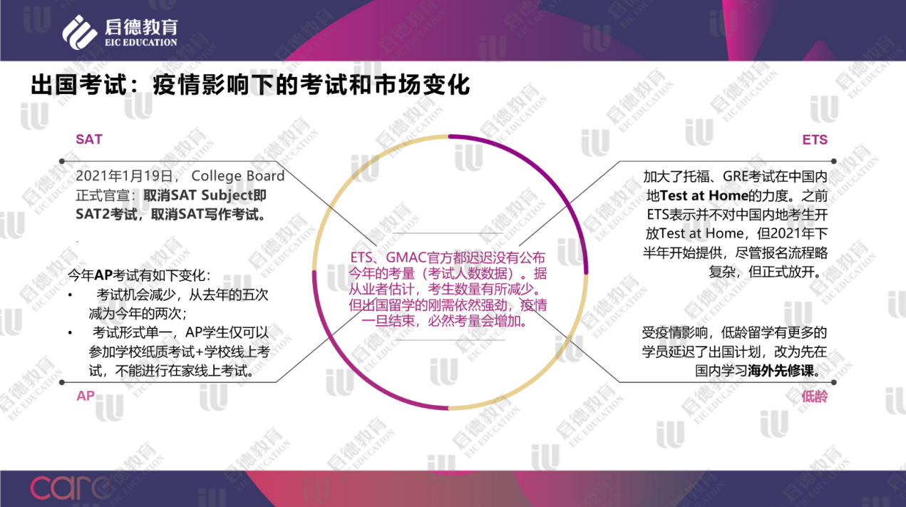 與此同時,國產(chǎn)疫苗被海外多國認(rèn)可。此外,各種跡象表明,作為最主要的留學(xué)語言,2021年英語考試認(rèn)證已放寬,考點(diǎn)也在增多。除了日本37所知名院校開展全英文授課外,韓國也可用英語成績遞交申請,法國提供1700個左右的英文授課課程,荷蘭碩士英語授課覆蓋率為95%,英語普及率在全世界非英語母語國家中最高。2021年1月19日,College Board正式宣布取消SAT Subject即SAT2考試,取消SAT寫作考試。2021年下半年 ETS對中國內(nèi)地考生開放Test at Home。同年,BC也在加快在中國內(nèi)地的雅思機(jī)考考點(diǎn)建設(shè)速度,計劃2022年將雅思機(jī)考考點(diǎn)覆蓋內(nèi)地四十多個城市。