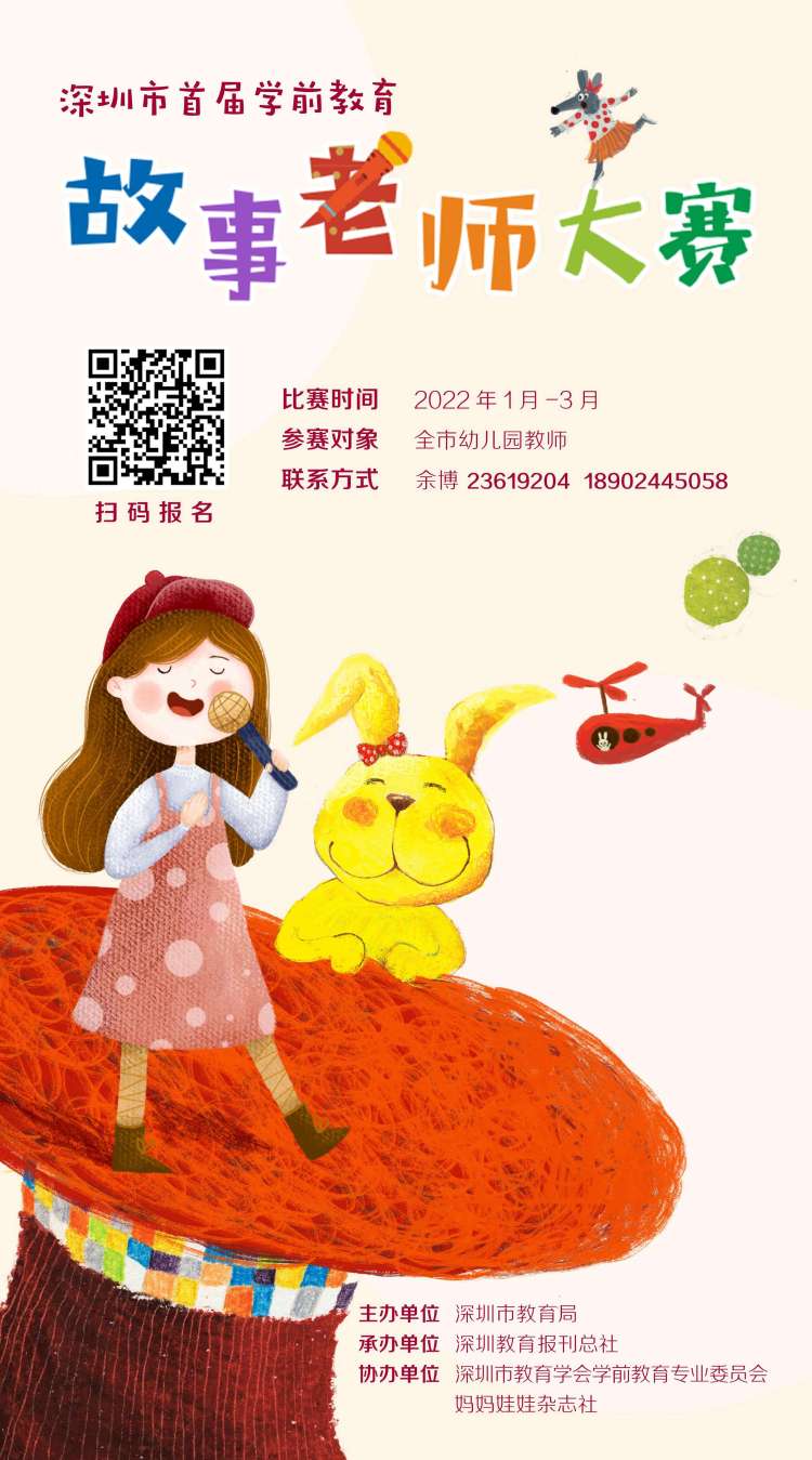 讀特客戶端·深圳新聞網(wǎng)2022年1月12日訊 (記者 陳彬 通訊員 程玉珂)由深圳市教育局主辦,深圳教育報(bào)刊總社承辦,深圳市教育學(xué)會(huì)學(xué)前教育專業(yè)委員會(huì)、媽媽娃娃雜志社協(xié)辦的深圳市首屆學(xué)前教育“故事老師”大賽暨原創(chuàng)繪本大賽將于2022年1-3月舉辦。