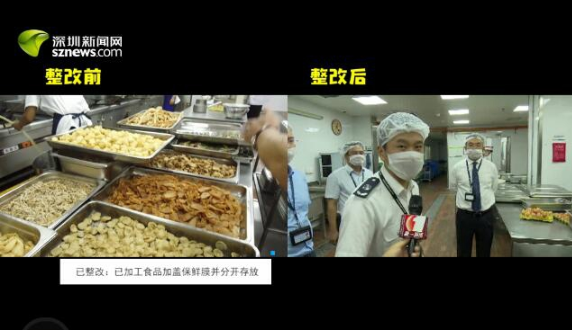 在7月4日的檢查中,執(zhí)法人員在僑城東食堂發(fā)現(xiàn)部分已加工食材存在疊放的現(xiàn)象、燒臘專間預(yù)進間清潔設(shè)施停擺等問題。在7月9日的回頭查復(fù)查中,執(zhí)法人員檢查發(fā)現(xiàn),食堂已對此問題進行了整改,食材均已加蓋了保鮮膜并分別存放,杜絕了交叉污染的情況發(fā)生;燒臘專間預(yù)進間清潔設(shè)施在此次檢查中也能夠正常工作。