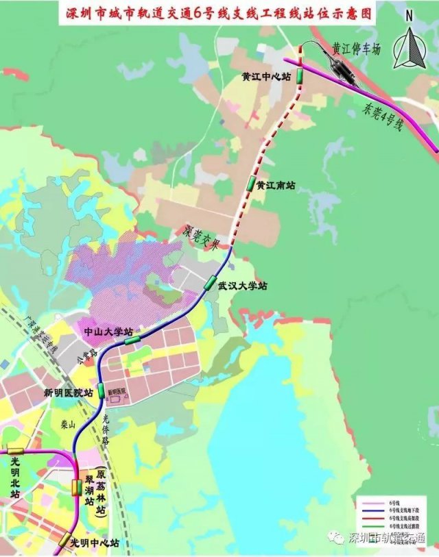 深圳地鐵6號線支線位于深圳市光明區(qū),起點設(shè)在6號線翠湖站東側(cè)(翠湖站為兩線換乘車站)、終點位于公常路深莞邊界,連接光明中心區(qū)和光明北區(qū)、中山大學(xué),與規(guī)劃建設(shè)的東莞1號線南延線銜接,包括4站4區(qū)間:翠湖站(原荔林站)、新明醫(yī)院站、中山大學(xué)站、武漢大學(xué)站。