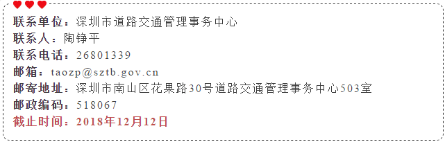 根據(jù)《深圳市機(jī)動(dòng)車道路臨時(shí)停放管理辦法》相關(guān)規(guī)定,市交委現(xiàn)就以上18條道路路邊停車泊位設(shè)置方案公開征求意見。市民如有意見和建議,可于2018年12月12日前反饋給市交委。郵寄地址為深圳市南山區(qū)花果路30號(hào)道路交通管理事務(wù)中心503室。