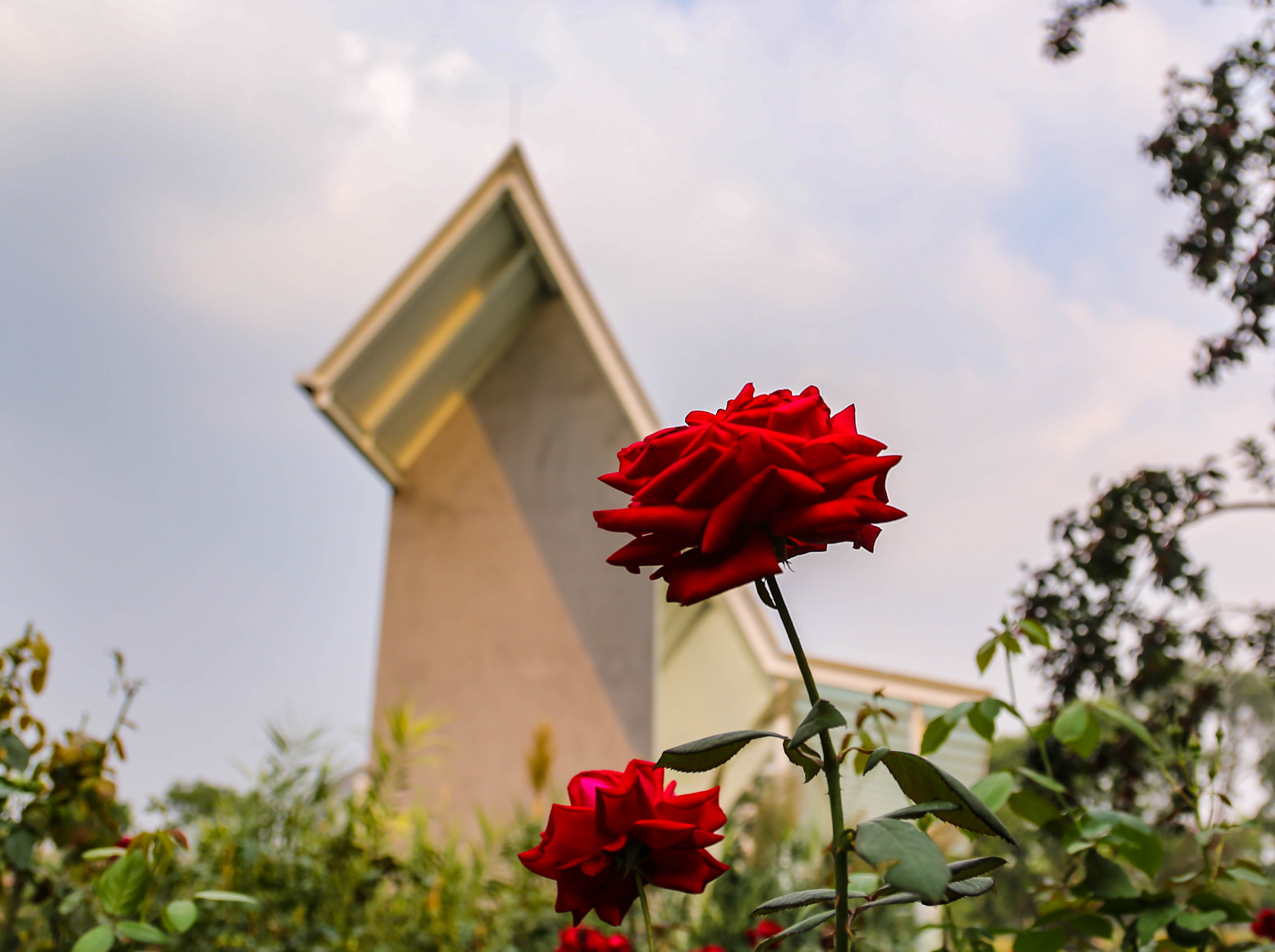 玫瑰花海的背景是兩座禮堂,相隔不到十米。