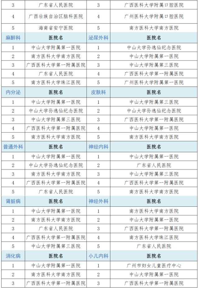 此外,廣東進入全國??魄笆钠渌麑?朴?中山三院的風(fēng)濕科;廣州市精神衛(wèi)生中心(廣州惠愛醫(yī)院)的精神醫(yī)學(xué);中山大學(xué)光華口腔醫(yī)院的口腔科;中山大學(xué)孫逸仙紀(jì)念醫(yī)院的泌尿外科、內(nèi)分泌科;廣州市婦兒中心的小兒外科;廣州醫(yī)科大學(xué)附屬第一醫(yī)院的胸外科;中山大學(xué)附屬腫瘤醫(yī)院的胸外科與腫瘤學(xué)。