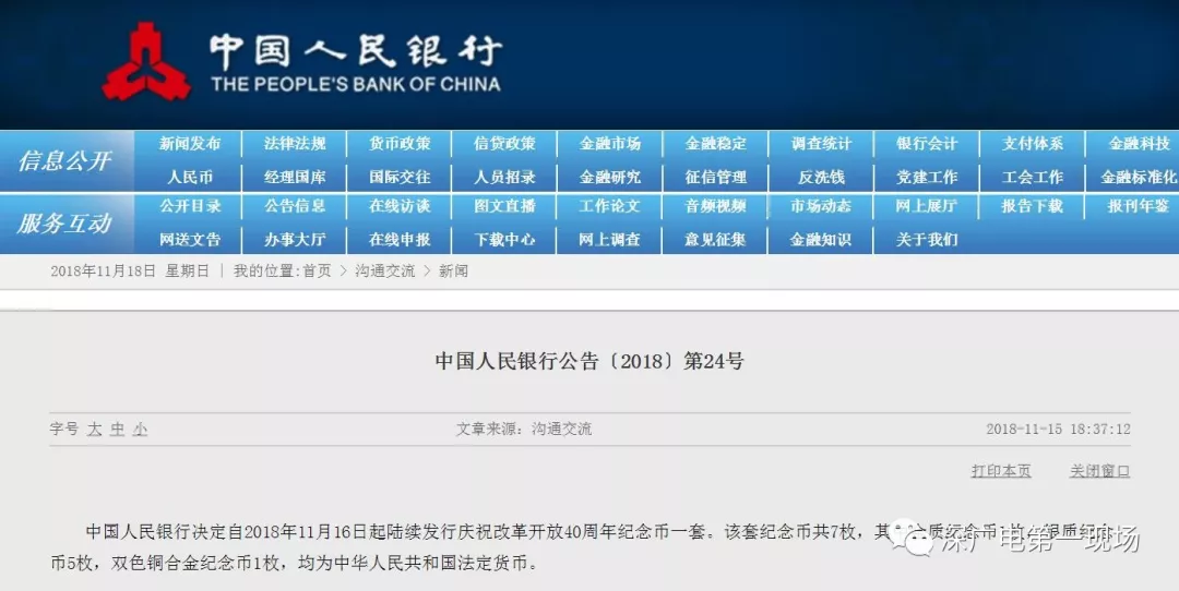 中國人民銀行決定自2018年11月16日起陸續(xù)發(fā)行慶祝改革開放40周年紀念幣一套。該套紀念幣共7枚,其中金質(zhì)紀念幣1枚,銀質(zhì)紀念幣5枚,雙色銅合金紀念幣1枚,均為中華人民共和國法定貨幣。面額分別分100元、50元、10元。