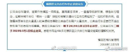 本月5號(hào),福田區(qū)城市管理局發(fā)布公告,稱福田區(qū)公共自行車一期于2019年1月1日停止運(yùn)營(yíng),公共自行車二期于2019年3月1日停止運(yùn)營(yíng)。