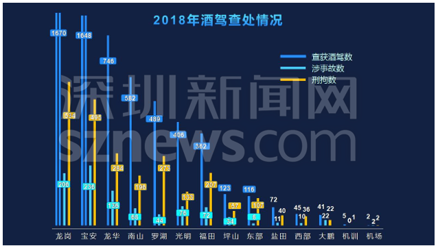 在發(fā)布會上,深圳交警偵查大隊三中隊副中隊長馬于兵重點分析了酒駕查處的區(qū)域分布情況。統(tǒng)計顯示,龍崗區(qū)以1670的酒駕查處量位列第一,寶安區(qū)、龍華區(qū)緊隨其后。