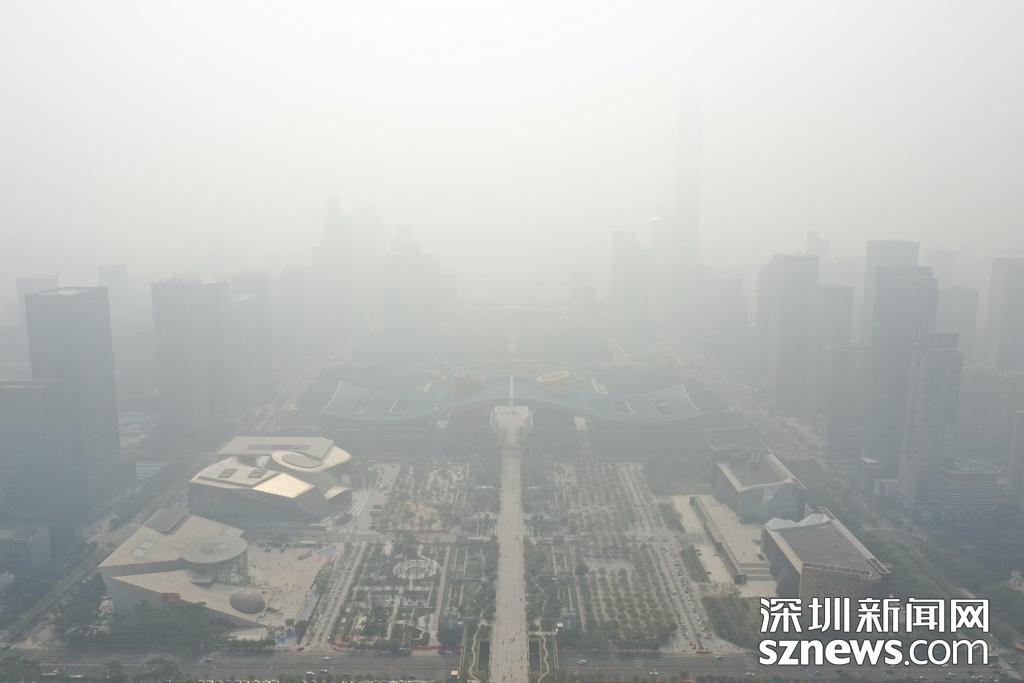 1月12日,霧霾襲深,深圳天氣君發(fā)布預(yù)警,今天最好不要在室外玩耍。記者中午用無(wú)人機(jī)航拍福田CBD區(qū)域,鏡頭下,市民中心和平安金融大廈兩個(gè)地標(biāo)幾乎無(wú)法辨別,新洲路上能見度很低,一切都仿佛浸在化不開的濃湯里。深圳天氣君在微博提醒:弱北風(fēng)影響下,不利于污染物擴(kuò)散,我市中西部地區(qū)下午會(huì)持續(xù)十面“霾”伏,灰霾黃色預(yù)警信號(hào)生效中,各位盡量不要長(zhǎng)時(shí)間戶外活動(dòng)。
