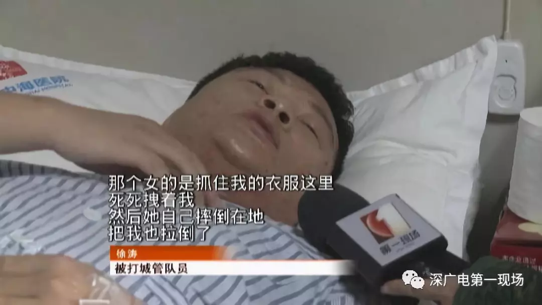 被打城管隊(duì)員徐濤:“她就一直罵,我站在那里,她吐口水直接吐在我臉上,然后我去手擋口水的時(shí)候,他兩公婆直接就上來(lái)打我。”
