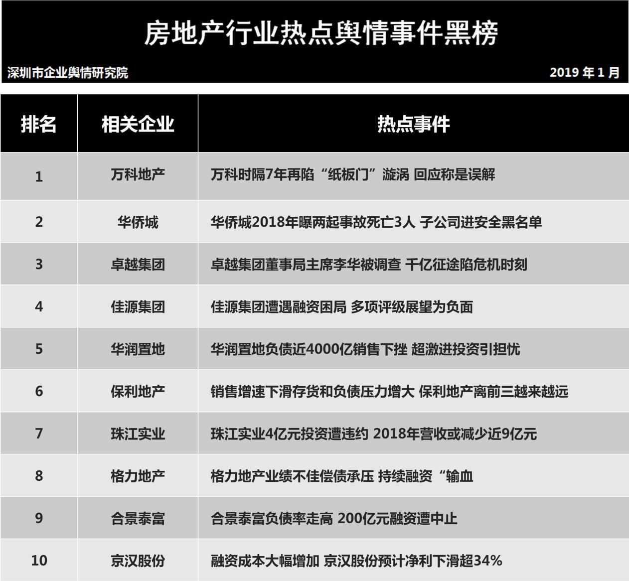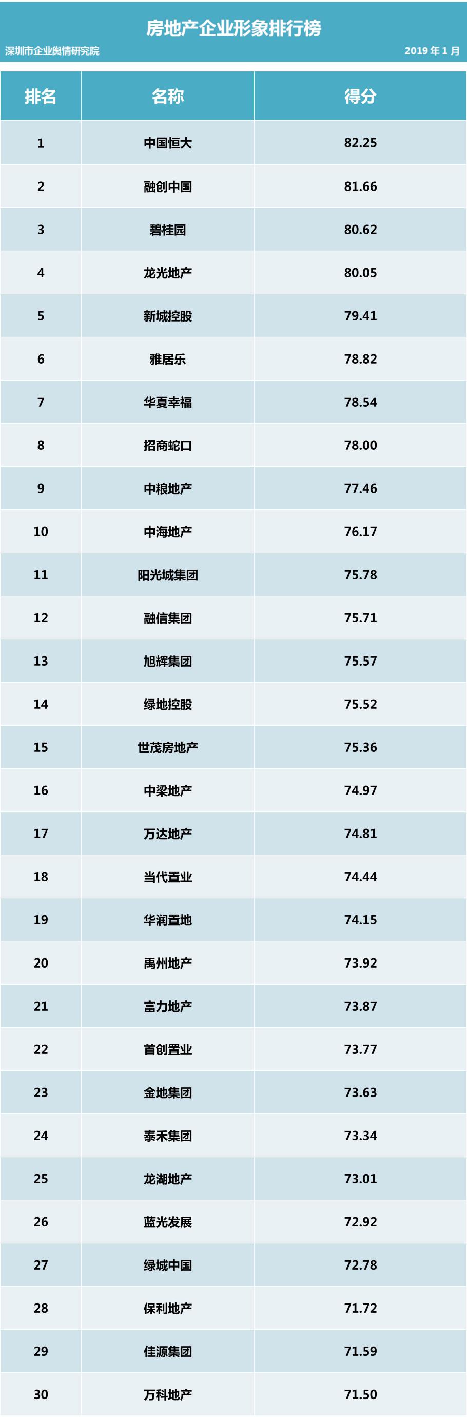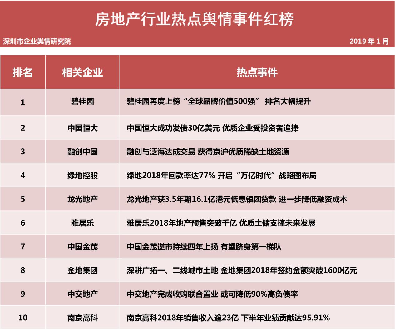 深圳新聞網(wǎng)2019年1月31日訊 (記者田志強 通訊員陳文光)1月31日,深圳企業(yè)輿情研究院發(fā)布第十二批企業(yè)輿情榜單。本次榜單重點聚焦房地產(chǎn)及醫(yī)藥保健兩個行業(yè)。房地產(chǎn)行業(yè)企業(yè)輿情榜單由房地產(chǎn)行業(yè)熱點輿情事件排行榜(紅、黑榜)及房地產(chǎn)企業(yè)公眾形象排行榜組成。
