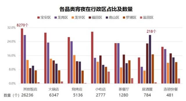 各品類宵夜在7個行政區(qū)占比及數量