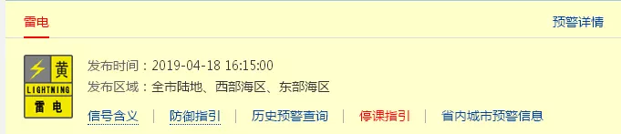 深圳市氣象臺(tái)于2019年04月18日16時(shí)15分在全市發(fā)布雷電預(yù)警,預(yù)計(jì)30-60分鐘內(nèi)全市將逐漸自西向東轉(zhuǎn)雷陣雨,按照防御預(yù)案停止戶外易燃易爆危險(xiǎn)作業(yè),并加強(qiáng)危化場所安全管理,正值下班放學(xué)高峰期,請注意防御。