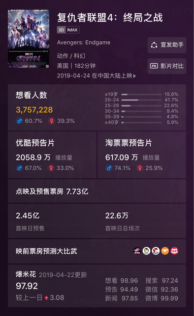 深圳新聞網(wǎng)4月24日訊(記者 陳婕)相信你的朋友圈已經(jīng)被“復(fù)聯(lián)4”占據(jù)了領(lǐng)地,而小記認(rèn)識(shí)的英雄還湊不齊一桌麻將。截至24日00點(diǎn),《復(fù)仇者聯(lián)盟4》預(yù)售已破7億!超《美國(guó)隊(duì)長(zhǎng)2》總票房,在《復(fù)聯(lián)4》的預(yù)售峰值期,淘票票預(yù)售市場(chǎng)占比過(guò)半。