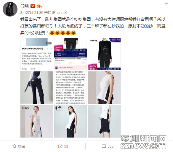 無獨有偶。5月5日,深圳影兒時尚集團(以下簡稱:影兒集團)正式向深圳市中級人民法院提起訴訟請求,就超模呂燕多次在微博上指責影兒集團是“抄抄集團”,造成影兒集團重大名譽損失和巨額經濟損失一事,起訴超模呂燕及其公司上海是你商貿有限公司不正當競爭,要求兩被告立即停止侵權行為,賠償經濟損失1000萬元,并公開道歉。
