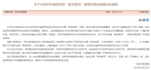 5月12日晚,深圳市教育局發(fā)布《關(guān)于對深圳市富源學(xué)?!案呖家泼瘛闭{(diào)查處理進展情況的通報》,通報稱,經(jīng)查實,深圳市富源學(xué)校2019年高考報名考生中,有32名考生屬“高考移民”,弄虛作假獲取廣東省報考資格。按照相關(guān)法例,對涉事32名學(xué)生取消在深圳市的高考報名資格,對深圳市富源學(xué)校予以行政處罰,核減該校2019年高中招生計劃的50%;責(zé)成深圳市富源學(xué)校董事會作出深刻檢查,責(zé)令深圳市富源學(xué)校對直接責(zé)任人及有關(guān)負責(zé)人進行嚴肅處理,認真整改存在問題,嚴格規(guī)范辦學(xué)行為。