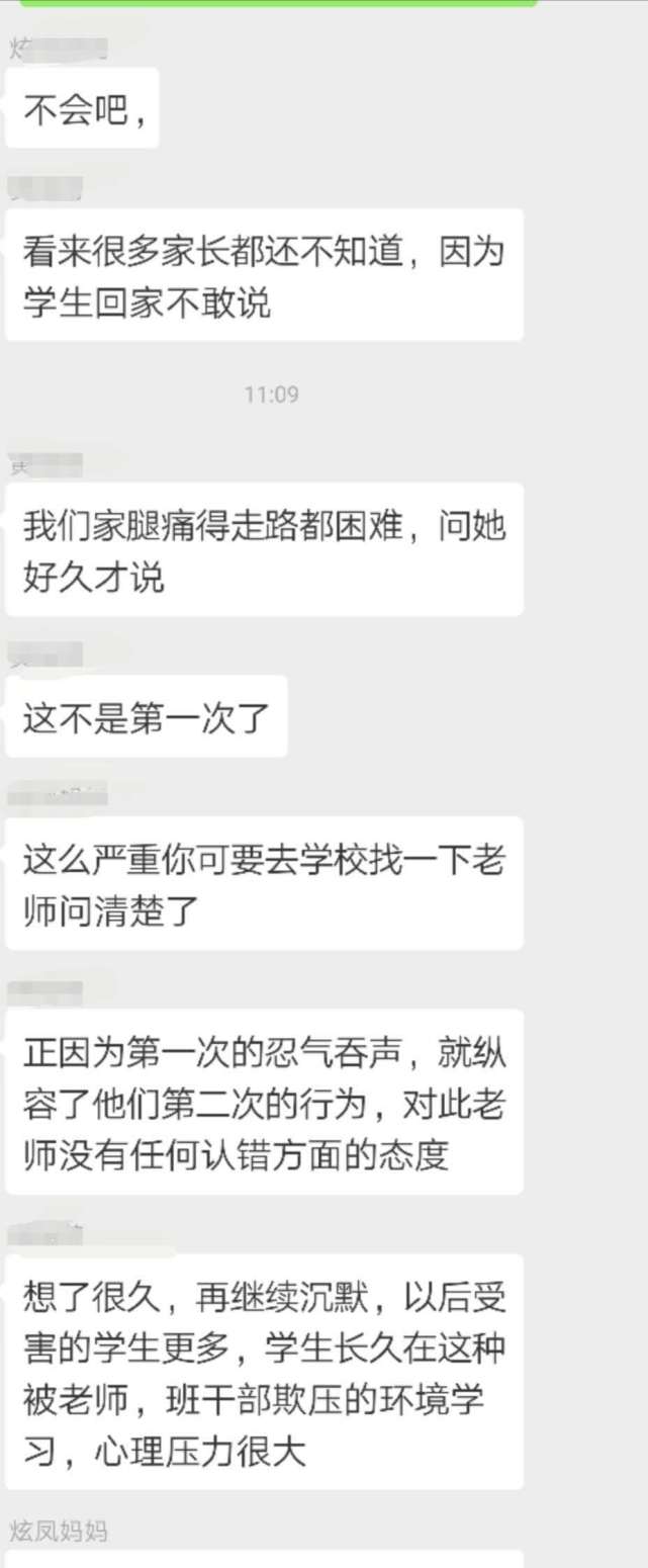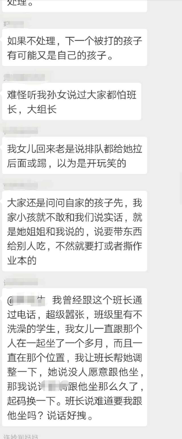 王先生把女兒的情況反映到家長群里,結果群里的家長紛紛表示,自己的孩子也反映當天遭遇到班長的毆打,有的孩子甚至“腿疼得難以走路”。而據(jù)孩子反映,其實類似的毆打在班上已經(jīng)不止發(fā)生過一次。這名班長是女生,平時很受班主任的信任,經(jīng)常利用班干部的權力隨意懲罰學生。“她曾經(jīng)多次要求班上同學給自己帶零食吃,不然就會被撕作業(yè)和毆打,還威脅不準告訴家長?!蓖跸壬Q,家長們已經(jīng)將情況反映給班主任,但是班主任的反應“相當冷淡”,只是說會了解一下情況。25日下午,記者電話聯(lián)系到了王先生女兒的班主任,他表示已經(jīng)就此事對班長進行了批評教育,但對于班長此前多次毆打同學的行為他表示并不知情,“當初讓這名同學做班長是因為她成績好,而且守紀律。而且我覺得,孩子之間有些矛盾很正常?!卑嘀魅握f。(記者 李東明)