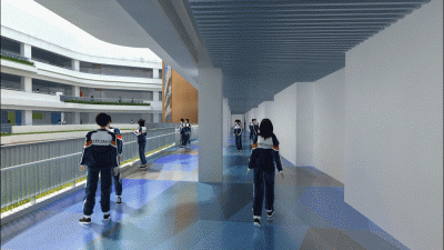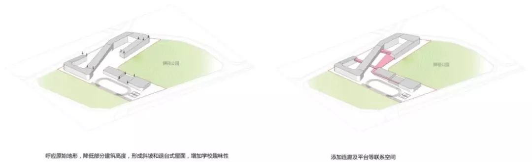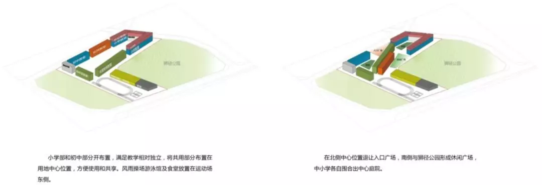 規(guī)劃采用了S型的布局關(guān)系,初中部和小學(xué)部各置一側(cè),各自有相對獨(dú)立的院落空間的同時,能夠照顧到空間的流通性,使得二者能夠方便地共享公共教學(xué)設(shè)施。