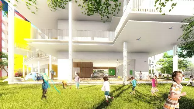 深圳市蓮花二村幼兒園重建校舍在緊張的用地中,首先退讓出一個完整的室外活動場地。通過立體剪裁出層層退臺的多元化的活動空間。南側向陽,北側遮雨,陰晴雨雪皆有孩子們的游樂天地。