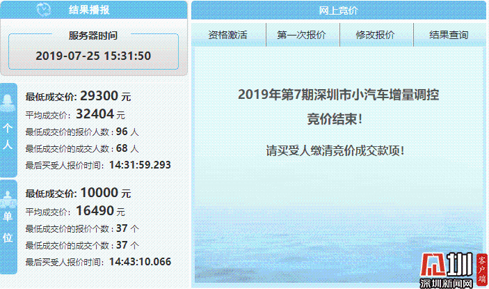 2019年第7期深圳小汽車車牌競價(jià)結(jié)果截圖