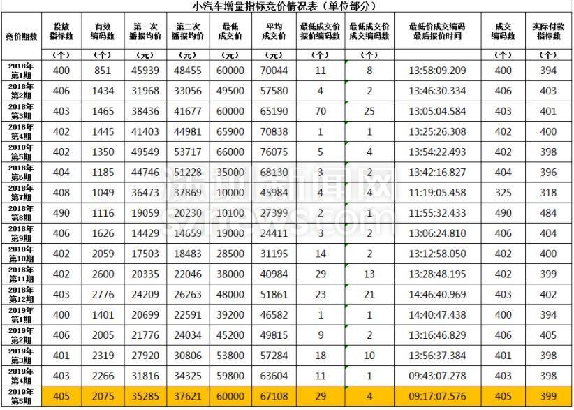 小汽車增量指標(biāo)競價(jià)情況表單位部分(2018年第一期——2019年第五期)