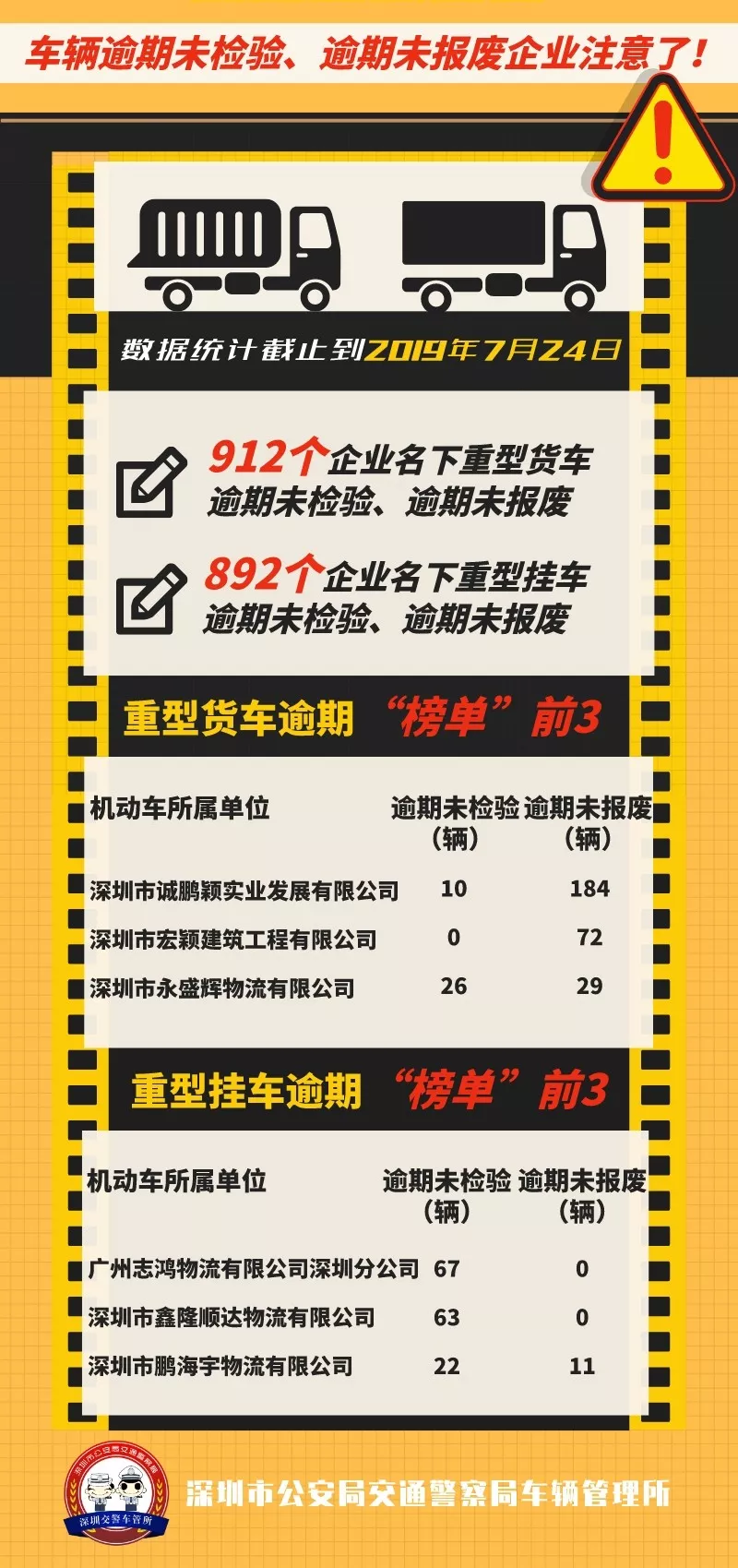 見圳客戶端·深圳新聞網(wǎng)2019年7月26日訊(見圳客戶端 深圳新聞網(wǎng)記者 何暢)車輛逾期未檢驗(yàn)、逾期未報(bào)廢,存在著重大交通安全隱患,深圳部分企業(yè)不重視安全管理、名下有大量“問題車輛”未處理。7月26日“深圳交警權(quán)威發(fā)布”微信公眾號就對相關(guān)企業(yè)進(jìn)行了點(diǎn)名曝光。