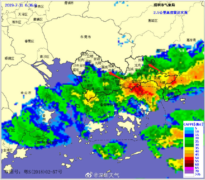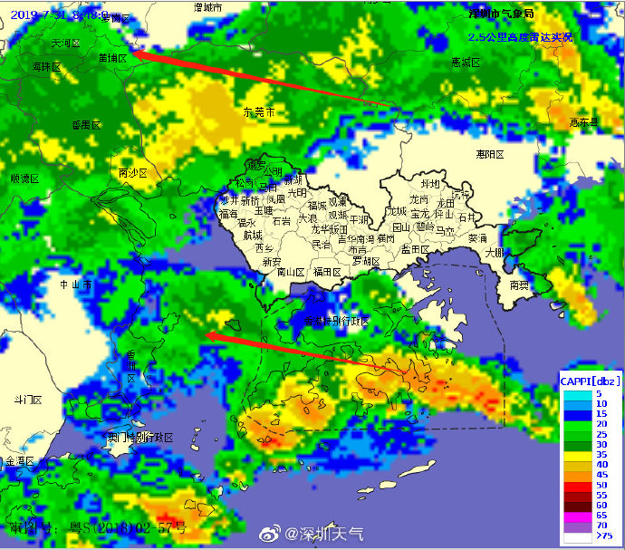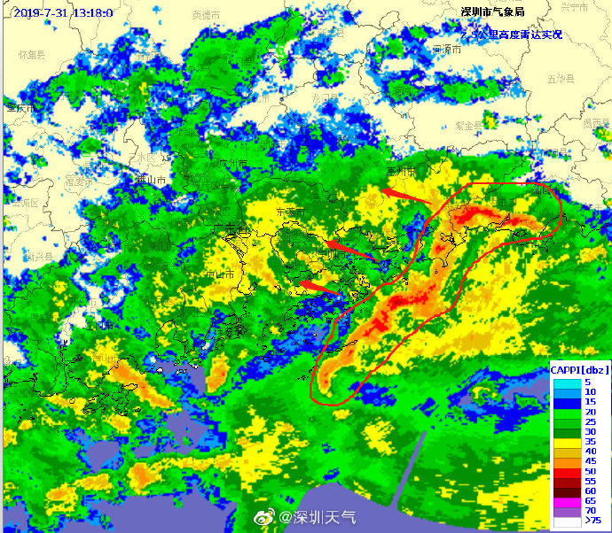當(dāng)一條雨帶的長軸和雨帶的移動(dòng)方向(箭頭)夾角很小時(shí),某個(gè)地方就會(huì)被這條雨帶幾乎從頭到尾地經(jīng)過,于是這個(gè)地方的累計(jì)雨量就會(huì)特別大。而現(xiàn)在深圳靠南的大部分區(qū)域就在經(jīng)歷一場列車效應(yīng),所以這場雨持續(xù)時(shí)間比較長,短時(shí)間內(nèi)停不下來。